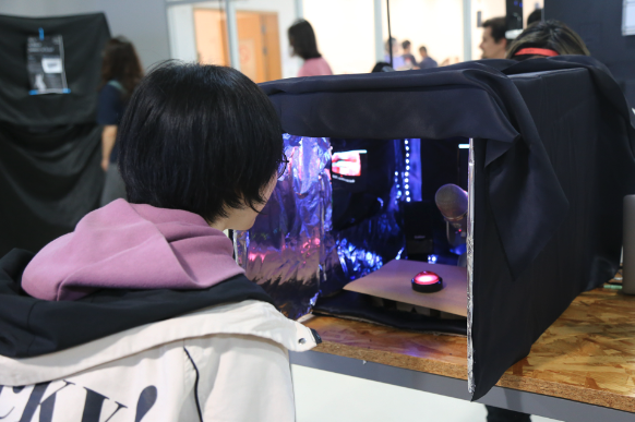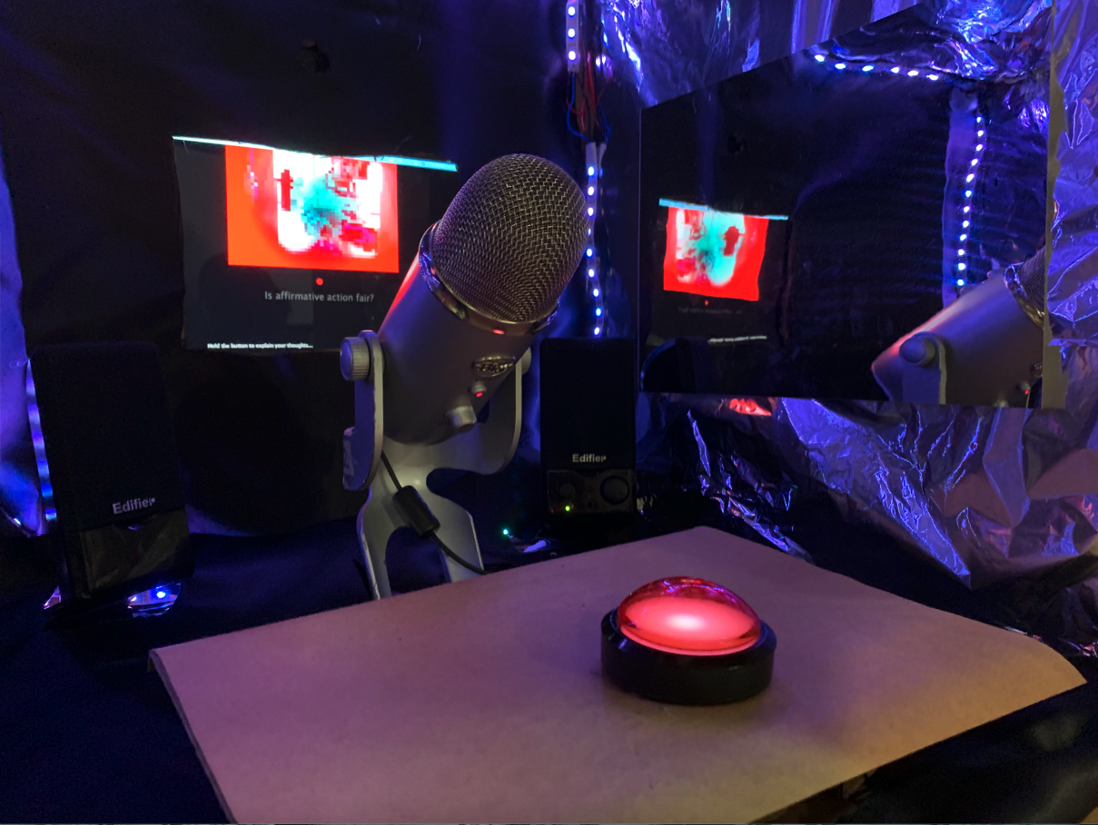 As the user looks into the Echo Chamber, they will find their pixelated reflection on the screen opposite them with a question prompting them to speak into the microphone. The experience is entirely dependent on the individual's interaction with the environment. Perhaps the user will answer the question for a long time. The users' interaction can reflect their individual position in political discourse.